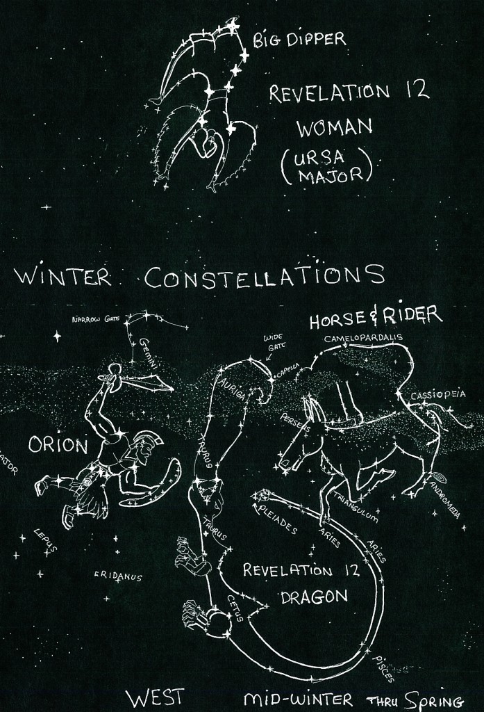 ABOVE PICTURE: latter winter constellation in the west – Orion – Revelation 12 Dragon (Hyades, Auriga, Pleiades, etc.) – Revelation 12 Woman (Ursa Major) – Goodly Horse (Persius, Cassiopeia, Andromeda, etc.) – Holy Ghost Rider (Camelopardalis)